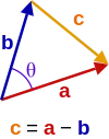 Given two vectors and separated by angle (see image right), they form a triangle with a third side . Let , and denote the lengths of , , and , respectively. The dot product of this with itself is: