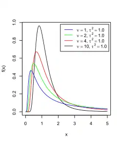 Instead of , the scaled inverse chi-squared distribution is however most frequently parametrized by the scale parameter and the distribution is denoted by .