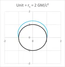 If the particle has just the right amount of energy for its angular momentum, u2 and u3 will merge. There are three solutions in this case. The orbit may spiral in to , approaching that radius as (asymptotically) a decreasing exponential in φ, , or . Or one can have a circular orbit at that radius. Or one can have an orbit that spirals down from that radius to the central point. The radius in question is called the inner radius and is between and 3 times rs. A circular orbit also results when is equal to , and this is called the outer radius. These different types of orbits are discussed below.
