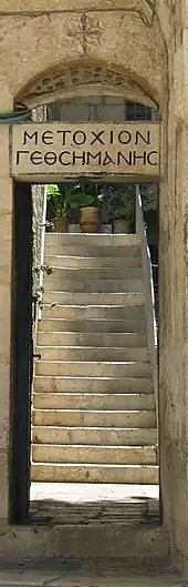 A plaque reading "Metochion of Gethsemane" (Μετόχιον Γεθσημανῆς) in Jerusalem, with a lunate sigma both at the end and in the middle of the word