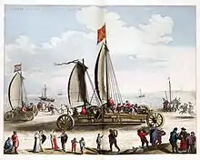 His contemporaries were most struck by his invention of a so-called land yacht, a carriage with sails, of which a model was preserved in Scheveningen until 1802. The carriage itself had been lost long before. Around the year 1600 Stevin, with Prince Maurice of Orange and twenty-six others, used the carriage on the beach between Scheveningen and Petten. The carriage was propelled solely by the force of wind and acquired a speed which exceeded that of horses.[7]