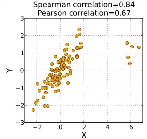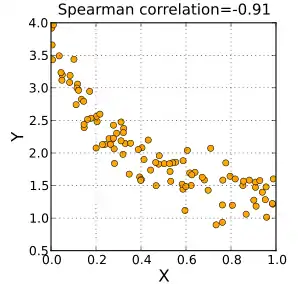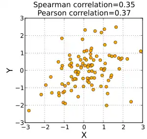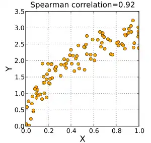 In statistics, Spearman's rank correlation coefficient or Spearman's ρ, named after Charles Spearman[1] and often denoted by the Greek letter (rho) or as , is a nonparametric measure of rank correlation (statistical dependence between the rankings of two variables). It assesses how well the relationship between two variables can be described using a monotonic function.
