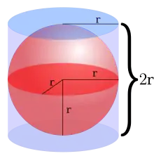 where r is the radius and d is the diameter of the sphere. Archimedes first derived this formula by showing that the volume inside a sphere is twice the volume between the sphere and the circumscribed cylinder of that sphere (having the height and diameter equal to the diameter of the sphere).[6] This may be proved by inscribing a cone upside down into semi-sphere, noting that the area of a cross section of the cone plus the area of a cross section of the sphere is the same as the area of the cross section of the circumscribing cylinder, and applying Cavalieri's principle.[7] This formula can also be derived using integral calculus, i.e. disk integration to sum the volumes of an infinite number of circular disks of infinitesimally small thickness stacked side by side and centered along the x-axis from x = −r to x = r, assuming the sphere of radius r is centered at the origin.