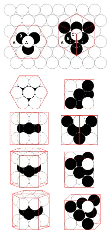 Two simple arrangements within the close-packed family correspond to regular lattices. One is called cubic close packing (or face-centred cubic, "FCC")—where the layers are alternated in the ABCABC... sequence. The other is called hexagonal close packing ("HCP"), where the layers are alternated in the ABAB... sequence. But many layer stacking sequences are possible (ABAC, ABCBA, ABCBAC, etc.), and still generate a close-packed structure. In all of these arrangements each sphere touches 12 neighboring spheres,[2] and the average density is