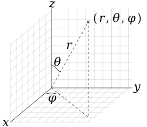 In mathematics, a spherical coordinate system is a coordinate system for three-dimensional space where the position of a given point in space is specified by three numbers, (r, θ, φ): the radial distance of the radial line r connecting the point to the fixed point of origin (which is located on a fixed polar axis, or zenith direction axis, or z-axis); the polar angle θ of the radial line r; and the azimuthal angle φ of the radial line r.