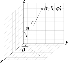 The physics convention. Spherical coordinates (r, θ, φ) as commonly used: (ISO 80000-2:2019): radial distance r (slant distance to origin), polar angle θ (theta) (angle with respect to positive polar axis), and azimuthal angle φ (phi) (angle of rotation from the initial meridian plane). This is the convention followed in this article.