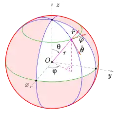are the local orthogonal unit vectors in the directions of increasing r, θ, and φ, respectively, and , ŷ, and are the unit vectors in Cartesian coordinates. The linear transformation to this right-handed coordinate triplet is a rotation matrix,