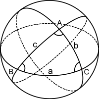 Spherical trigonometry is the branch of spherical geometry that deals with the metrical relationships between the sides and angles of spherical triangles, traditionally expressed using trigonometric functions. On the sphere, geodesics are great circles. Spherical trigonometry is of great importance for calculations in astronomy, geodesy, and navigation.