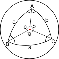 - Sides are denoted by lower-case letters: a, b, and c. The sphere has a radius of 1, and so the side lengths and lower case angles are equivalent (see arc length).