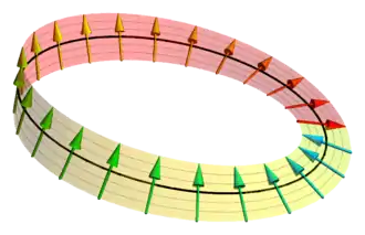 In geometry and physics, spinors (/spɪnər/) are elements of a complex number-based vector space that can be associated with Euclidean space.[lower-alpha 2] A spinor transforms linearly when the Euclidean space is subjected to a slight (infinitesimal) rotation,[lower-alpha 3] but unlike geometric vectors and tensors, a spinor transforms to its negative when the space rotates through 360° (see picture). It takes a rotation of 720° for a spinor to go back to its original state. This property characterizes spinors: spinors can be viewed as the "square roots" of vectors (although this is inaccurate and may be misleading; they are better viewed as "square roots" of sections of vector bundles – in the case of the exterior algebra bundle of the cotangent bundle, they thus become "square roots" of differential forms).