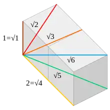 Geometrically, the square root of 2 is the length of a diagonal across a square with sides of one unit of length; this follows from the Pythagorean theorem. It was probably the first number known to be irrational.[1] The fraction 99/70 (≈ 1.4142857) is sometimes used as a good rational approximation with a reasonably small denominator.