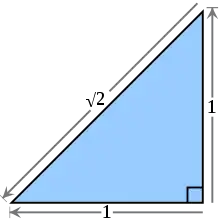 ![]() The square root of 2 is equal to the length of the hypotenuse of an isosceles right triangle with legs of length 1. | |