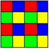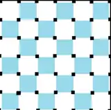 The square tiling can be used as a circle packing, placing equal diameter circles at the center of every point. Every circle is in contact with 4 other circles in the packing (kissing number).[2] The packing density is π/4=78.54% coverage. There are 4 uniform colorings of the circle packings.