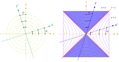 Spacetime geometry is conventionally developed as follows: Select (0,0) for a "here and now" in a spacetime. Light radiant left and right through this central event tracks two lines in the spacetime, lines that can be used to give coordinates to events away from (0,0). Trajectories of lesser velocity track closer to the original timeline (0,t). Any such velocity can be viewed as a zero velocity under a squeeze mapping called a Lorentz boost. This insight follows from a study of split-complex number multiplications and the diagonal basis which corresponds to the pair of light lines. Formally, a squeeze preserves the hyperbolic metric expressed in the form xy; in a different coordinate system. This application in the theory of relativity was noted in 1912 by Wilson and Lewis,[4] by Werner Greub,[5] and by Louis Kauffman.[6] Furthermore, the squeeze mapping form of Lorentz transformations was used by Gustav Herglotz (1909/10)[7] while discussing Born rigidity, and was popularized by Wolfgang Rindler in his textbook on relativity, who used it in his demonstration of their characteristic property.[8]