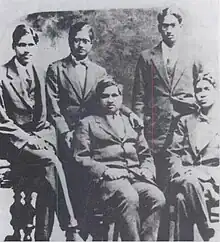 Ramanujan (centre) and his colleague G. H. Hardy (rightmost), with other scientists, outside the Senate House, Cambridge, c.1914–19