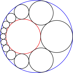 In geometry, a Steiner chain is a set of n circles, all of which are tangent to two given non-intersecting circles (blue and red in Figure 1), where n is finite and each circle in the chain is tangent to the previous and next circles in the chain. In the usual closed Steiner chains, the first and last (n-th) circles are also tangent to each other; by contrast, in open Steiner chains, they need not be. The given circles α and β do not intersect, but otherwise are unconstrained; the smaller circle may lie completely inside or outside of the larger circle. In these cases, the centers of Steiner-chain circles lie on an ellipse or a hyperbola, respectively.