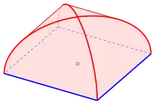 The upper half of a bicylinder is the square case of a domical vault, a dome-shaped solid based on any convex polygon whose cross-sections are similar copies of the polygon, and analogous formulas calculating the volume and surface area of a domical vault as a rational multiple of the volume and surface area of its enclosing prism hold more generally.[7] In China, the bicylinder is known as Mou he fang gai, literally "two square umbrella"; it was described by the third-century mathematician Liu Hui.[8]