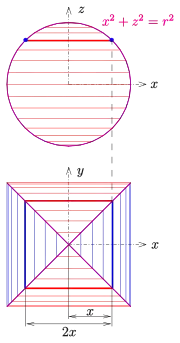 Deriving the volume of a bicylinder (white) can be done by packing it in a cube (red). A plane (parallel with the cylinders' axes) intersecting the bicylinder forms a square and its intersection with the cube is a larger square. The difference between the areas of the two squares is the same as 4 small squares (blue). As the plane moves through the solids, these blue squares describe square pyramids with isosceles faces in the corners of the cube; the pyramids have their apexes at the midpoints of the four cube edges. Moving the plane through the whole bicylinder describes a total of 8 pyramids.