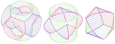The intersection of three cylinders with perpendicularly intersecting axes generates a surface of a solid with vertices where 3 edges meet and vertices where 4 edges meet. The set of vertices can be considered as the edges of a rhombic dodecahedron. The key for the determination of volume and surface area is the observation that the tricylinder can be resampled by the cube with the vertices where 3 edges meet (s. diagram) and 6 curved pyramids (the triangles are parts of cylinder surfaces). The volume and the surface area of the curved triangles can be determined by similar considerations as it is done for the bicylinder above.[1][6]