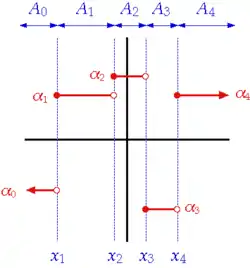 An example of step functions (the red graph). In this function, each constant subfunction with a function value αi (i = 0, 1, 2, ...) is defined by an interval Ai and intervals are distinguished by points xj (j = 1, 2, ...). This particular step function is right-continuous.