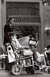 Hawking rarely discussed his illness and physical challenges—even, in a precedent set during their courtship, with Jane.[225] His disabilities meant that the responsibilities of home and family rested firmly on his wife's increasingly overwhelmed shoulders, leaving him more time to think about physics.[226] Upon his appointment in 1974 to a year-long position at the California Institute of Technology in Pasadena, California, Jane proposed that a graduate or post-doctoral student live with them and help with his care. Hawking accepted, and Bernard Carr travelled with them as the first of many students who fulfilled this role.[227][228] The family spent a generally happy and stimulating year in Pasadena.[229]