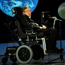 When Hawking first began using a wheelchair he was using standard motorised models. The earliest surviving example of these chairs was made by BEC Mobility and sold by Christie's in November 2018 for £296,750.[265] Hawking continued to use this type of chair until the early 1990s, at which time his ability to use his hands to drive a wheelchair deteriorated. Hawking used a variety of different chairs from that time, including a DragonMobility Dragon elevating powerchair from 2007, as shown in the April 2008 photo of Hawking attending NASA's 50th anniversary;[266] a Permobil C350 from 2014; and then a Permobil F3 from 2016.[267]