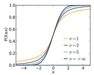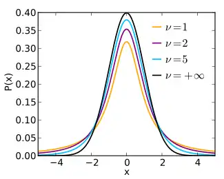 However, has heavier tails and the amount of probability mass in the tails is controlled by the parameter For the Student's t distribution becomes the standard Cauchy distribution, which has very "fat" tails; whereas for it becomes the standard normal distribution which has very "thin" tails.