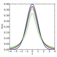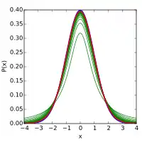 The following images show the density of the t distribution for increasing values of The normal distribution is shown as a blue line for comparison. Note that the t distribution (red line) becomes closer to the normal distribution as increases.