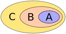 A is a subset of B (denoted ) and, conversely, B is a superset of A (denoted ).