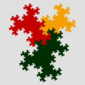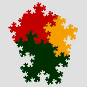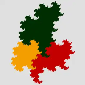 Associated to this string rewriting process is a compact set composed of self-similar tiles called the Rauzy fractal, that visualizes the combinatorial information contained in a multiple-generation three-letter sequence.[11]
