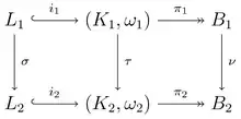 Two Lagrangian maps (π1 ∘ i1) : L1 ↪ K1 ↠ B1 and (π2 ∘ i2) : L2 ↪ K2 ↠ B2 are called Lagrangian equivalent if there exist diffeomorphisms σ, τ and ν such that both sides of the diagram given on the right commute, and τ preserves the symplectic form.[4] Symbolically: