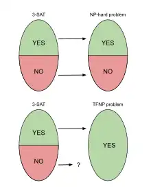 NP is one of the most widely studied complexity classes. The conjecture that there are intractable problems in NP is widely accepted and often used as the most basic hardness assumption. Therefore, it is only natural to ask how TFNP is related to NP. It is not difficult to see that solutions to problems in NP can imply solutions to problems in TFNP. However, there are no TFNP problems which are known to be NP-hard. Intuition for this fact comes from the fact that problems in TFNP are total. For a problem to be NP-hard, there must exist a reduction from some NP-complete problem to the problem of interest. A typical reduction from problem A to problem B is performed by creating and analyzing a map that sends "yes" instances of A to "yes" instances of B and "no" instances of A to "no" instances of B. However, TFNP problems are total, so there are no "no" instances for this type of reduction, causing common techniques to be difficult to apply. Beyond this rough intuition, there are several concrete results that suggest that it might be difficult or even impossible to prove NP-hardness for TFNP problems. For example, if any TFNP problem is NP-complete, then NP = coNP,[3] which is generally conjectured to be false, but is still a major open problem in complexity theory. This lack of connections with NP is a major motivation behind the study of TFNP as its own independent class.