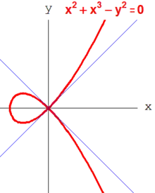 is singular at the origin, because both partial derivatives of f(x, y) = y2 x3 x2 vanish at (0, 0). Thus the Zariski tangent space to C at the origin is the whole plane, and has higher dimension than the curve itself (two versus one). On the other hand, the tangent cone is the union of the tangent lines to the two branches of C at the origin,