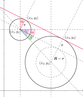 Here R and r notate the radii of the two circles and the angle α can be computed using basic trigonometry. You have α = γ − β with[4]