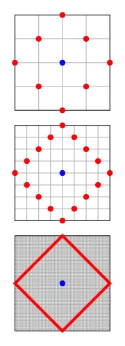 A closed ball (or closed disk in the 2-dimensional case) is a filled-in sphere, the set of points at distance less than or equal to the radius from a specific center. For cellular automata on a square grid, a taxicab disk is the von Neumann neighborhood of range r of its center.