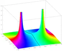 on the compactified complex plane. It has simple poles at and , and it is analytic elsewhere. Now its Taylor series centered at z0 converges on any disc B(z0, r) with r < |z − z0|, where the same Taylor series converges at z ∈ C. Therefore, Taylor series of f centered at 0 converges on B(0, 1) and it does not converge for any z ∈ C with |z| > 1 due to the poles at i and −i. For the same reason the Taylor series of f centered at 1 converges on and does not converge for any z ∈ C with .