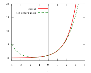 In calculus, Taylor's theorem gives an approximation of a -times differentiable function around a given point by a polynomial of degree , called the -th-order Taylor polynomial. For a smooth function, the Taylor polynomial is the truncation at the order of the Taylor series of the function. The first-order Taylor polynomial is the linear approximation of the function, and the second-order Taylor polynomial is often referred to as the quadratic approximation.[1] There are several versions of Taylor's theorem, some giving explicit estimates of the approximation error of the function by its Taylor polynomial.