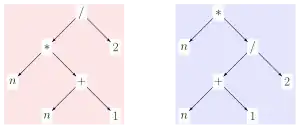 Originally, logicians defined a term to be a character string adhering to certain building rules.[2] However, since the concept of tree became popular in computer science, it turned out to be more convenient to think of a term as a tree. For example, several distinct character strings, like "(n⋅(n+1))/2", "((n⋅(n+1)))/2", and "", denote the same term and correspond to the same tree, viz. the left tree in the above picture. Separating the tree structure of a term from its graphical representation on paper, it is also easy to account for parentheses (being only representation, not structure) and invisible multiplication operators (existing only in structure, not in representation).