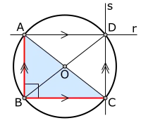 Let there be a right angle ∠ ABC, r a line parallel to BC passing by A, and s a line parallel to AB passing by C. Let D be the point of intersection of lines r and s. (It has not been proven that D lies on the circle.)