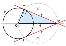Thales's theorem can be used to construct the tangent to a given circle that passes through a given point. In the figure at right, given circle k with centre O and the point P outside k, bisect OP at H and draw the circle of radius OH with centre H. OP is a diameter of this circle, so the triangles connecting OP to the points T and T′ where the circles intersect are both right triangles.