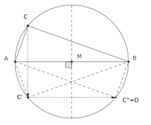 In geometry, Thales's theorem states that if A, B, and C are distinct points on a circle where the line AC is a diameter, the angle ∠ ABC is a right angle. Thales's theorem is a special case of the inscribed angle theorem and is mentioned and proved as part of the 31st proposition in the third book of Euclid's Elements.[1] It is generally attributed to Thales of Miletus, but it is sometimes attributed to Pythagoras.