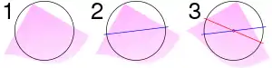 Thales's theorem can also be used to find the centre of a circle using an object with a right angle, such as a set square or rectangular sheet of paper larger than the circle.[7] The angle is placed anywhere on its circumference (figure 1). The intersections of the two sides with the circumference define a diameter (figure 2). Repeating this with a different set of intersections yields another diameter (figure 3). The centre is at the intersection of the diameters.