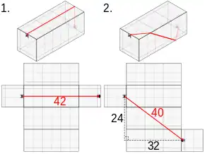 A naive solution is for the spider to remain horizontally centred, and crawl up to the ceiling, across it and down to the fly, giving a distance of 42 feet. Instead, the shortest path, 40 feet long, spirals around five of the six faces of the cuboid. Alternatively, it can be described by unfolding the cuboid into a net and finding a shortest path (a line segment) on the resulting unfolded system of six rectangles in the plane. Different nets produce different segments with different lengths, and the question becomes one of finding a net whose segment length is minimum.[2] Another path, of intermediate length , crosses diagonally through four faces instead of five.[3]