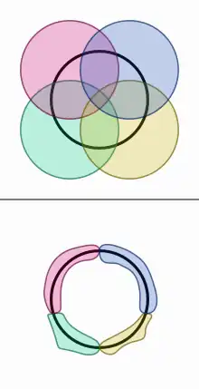 The first image shows a refinement (on the bottom) of a colored cover (on the top) of a black circular line. Note how in the refinement, no point on the circle is contained in more than two sets, and also how the sets link to one another to form a "chain". |