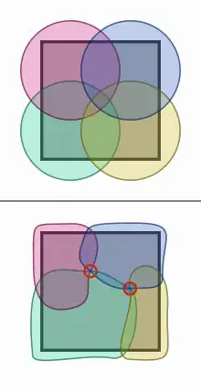 The top half of the second image shows a cover (colored) of a planar shape (dark), where all of the shape's points are contained in anywhere from one to all four of the cover's sets. The bottom illustrates that any attempt to refine said cover such that no point would be contained in more than two sets—ultimately fails at the intersection of set borders. Thus, a planar shape is not "webby": it cannot be covered with "chains", per se. Instead, it proves to be thicker in some sense. More rigorously put, its topological dimension must be greater than 1. |