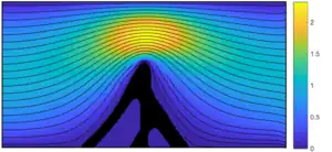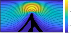 Fluid-structure-interaction is a strongly coupled phenomenon and concerns the interaction between a stationary or moving fluid and an elastic structure. Many engineering applications and natural phenomena are subject to fluid-structure-interaction and to take such effects into consideration is therefore critical in the design of many engineering applications. Topology optimisation for fluid structure interaction problems has been studied in e.g. references[11][12][13] and.[14] Design solutions solved for different Reynolds numbers are shown below. The design solutions depend on the fluid flow with indicate that the coupling between the fluid and the structure is resolved in the design problems.