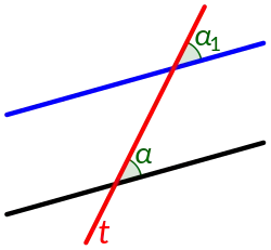 If the angles of one pair of corresponding angles are congruent, then the angles of each of the other pairs are also congruent. In the various images with parallel lines on this page, corresponding angle pairs are: α=α1, β=β1, γ=γ1 and δ=δ1.