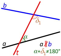 Euclid's Proposition 27 states that if a transversal intersects two lines so that alternate interior angles are congruent, then the lines are parallel. Euclid proves this by contradiction: If the lines are not parallel then they must intersect and a triangle is formed. Then one of the alternate angles is an exterior angle equal to the other angle which is an opposite interior angle in the triangle. This contradicts Proposition 16 which states that an exterior angle of a triangle is always greater than the opposite interior angles.[5]: 307 [3]: Art. 88