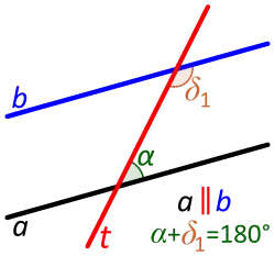 In geometry, a transversal is a line that passes through two lines in the same plane at two distinct points. Transversals play a role in establishing whether two or more other lines in the Euclidean plane are parallel. The intersections of a transversal with two lines create various types of pairs of angles: consecutive interior angles, consecutive exterior angles, corresponding angles, and alternate angles. As a consequence of Euclid's parallel postulate, if the two lines are parallel, consecutive interior angles are supplementary, corresponding angles are equal, and alternate angles are equal.