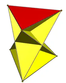Schönhardt polyhedron is another polyhedron constructed from a triangular prism with equilateral triangle bases. This way, one of its bases rotates around the prism's centerline and breaks the square faces into skew polygons. Each square face can be re-triangulated with two triangles to form a non-convex dihedral angle.[15] As a result, the Schönhardt polyhedron cannot be triangulated by a partition into tetrahedra. It is also that the Schönhardt polyhedron has no internal diagonals.[16] It is named after German mathematician Erich Schönhardt, who described it in 1928, although the related structure was exhibited by artist Karlis Johansons in 1921.[17]